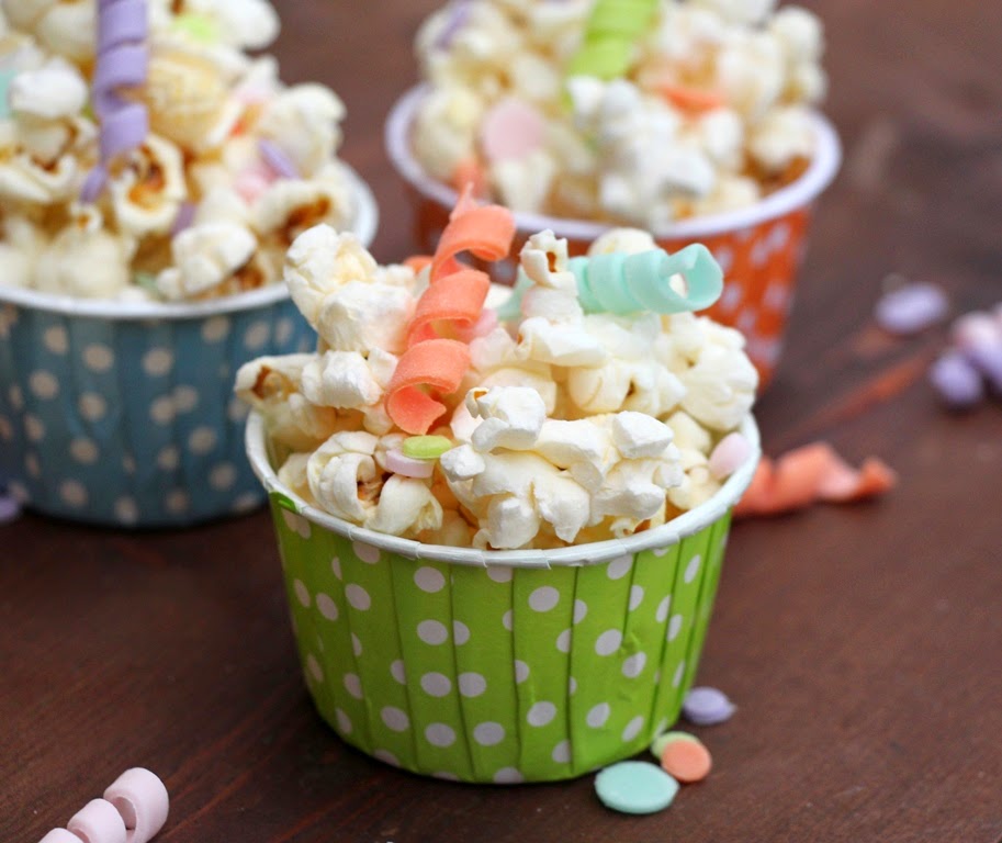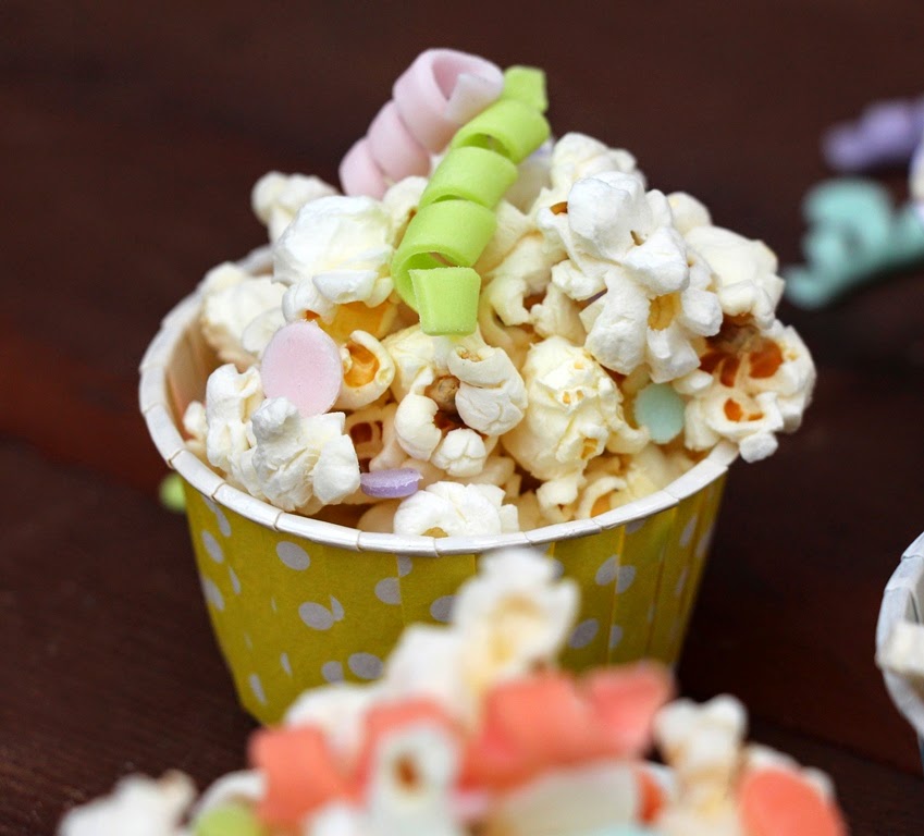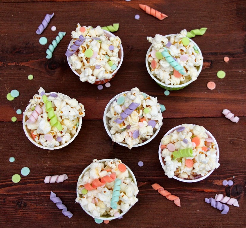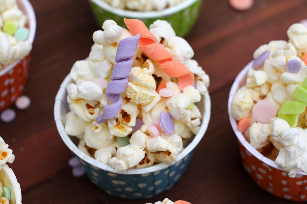 Quando non sentirete più il gioioso scoppiettio dei pop corn, versateli in una ciotola oppure in tante coppettine colorate (come nel nostro caso) e decorate con zuccherini e stelle filanti di zucchero.